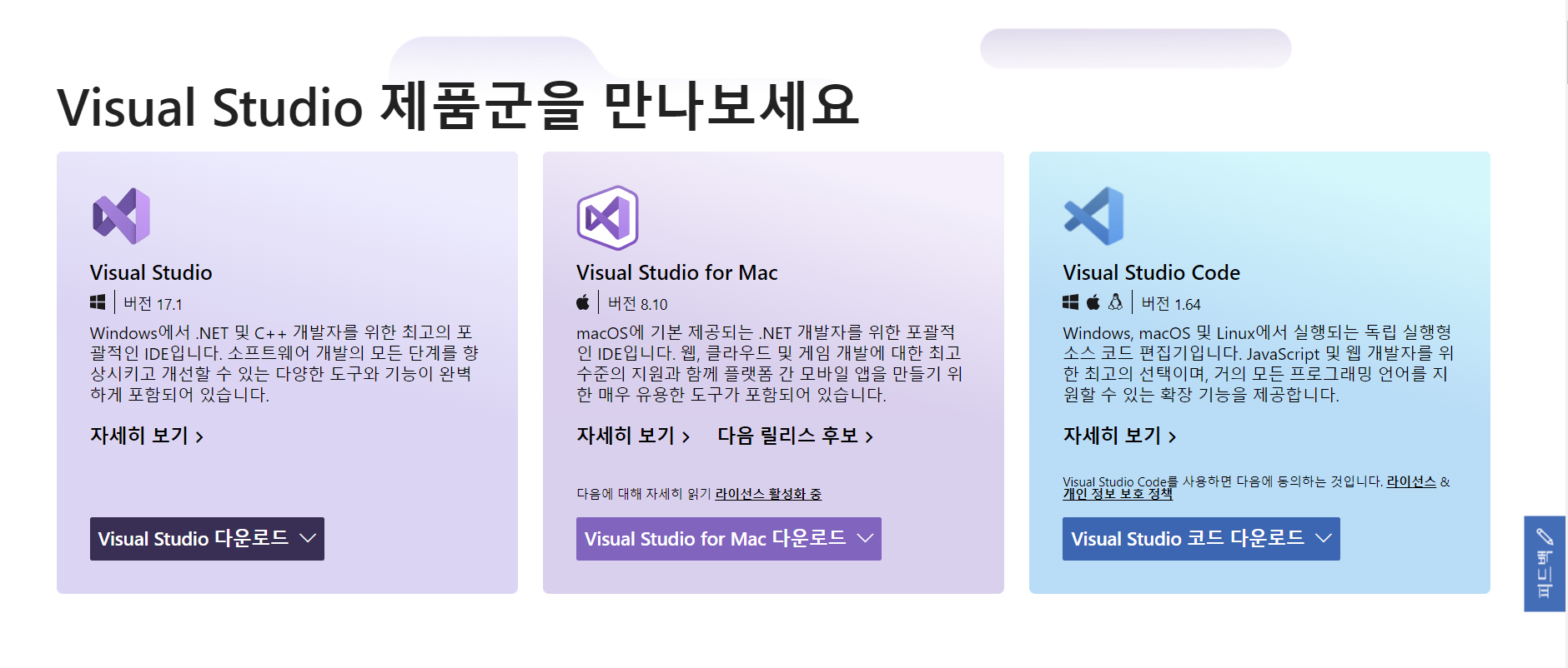 https://visualstudio.microsoft.com/ko/ 로 들어가면 아래와 같은 화면이 나온다.